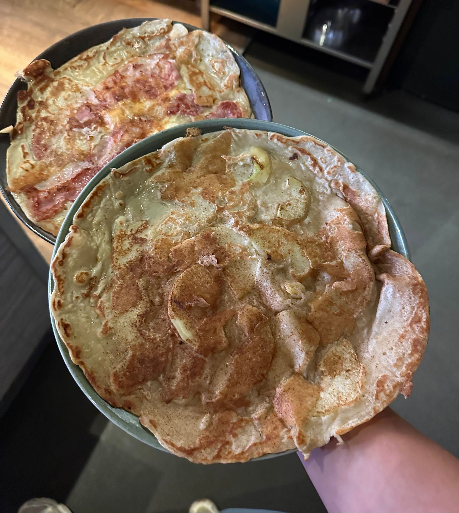 (worstenbroodje, mini pancake, gebakken ei op sneetje brood, yoghurt met muesli en fruit, glaasje verse jus.)